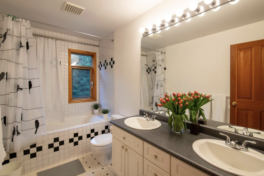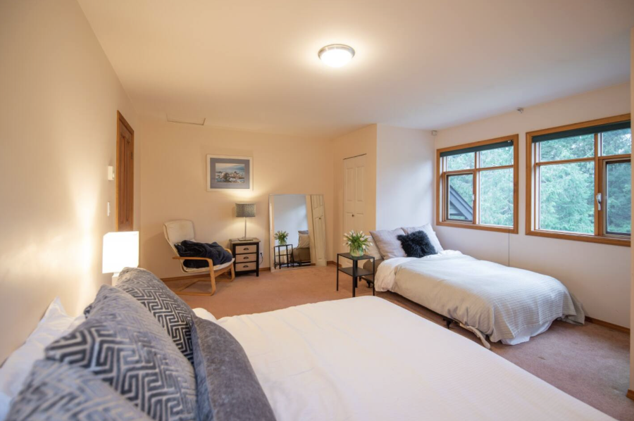 This room is designed for two guests, each with their own bed (king and XL twin). The full bathroom is shared with the guests in the shared room (seen above) and includes a tub/shower + two sinks.